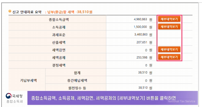 - 종합소득금액, 소득공제 내역, 세액감면, 결정세액을 확인힐 수 있습니다.