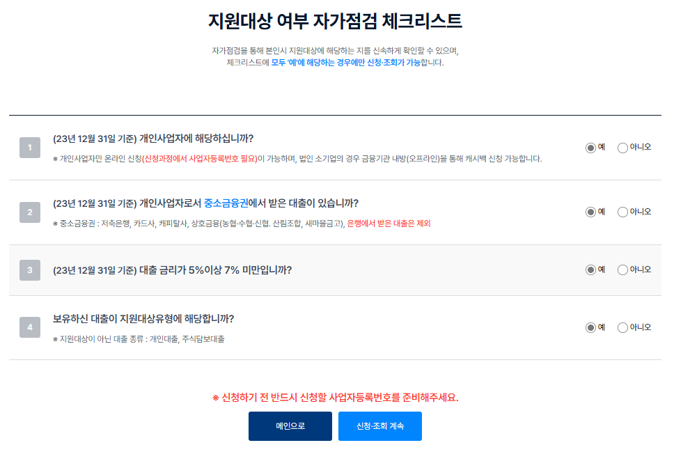 지원대상 여부 자가점검 체크리스트로 대상 조회를 우선 확인할 수 있으니 확인해 보시기 바랍니다.