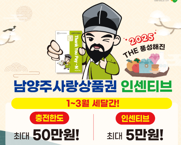 2025년 1월부터 3월까지 남양주시에서는 지역화폐 충전금액을 최대 50만원까지 가능하도록 하고있습니다. 지역소비 촉진과 소상공인 매출 증대를 위해 시행한다고 합니다.